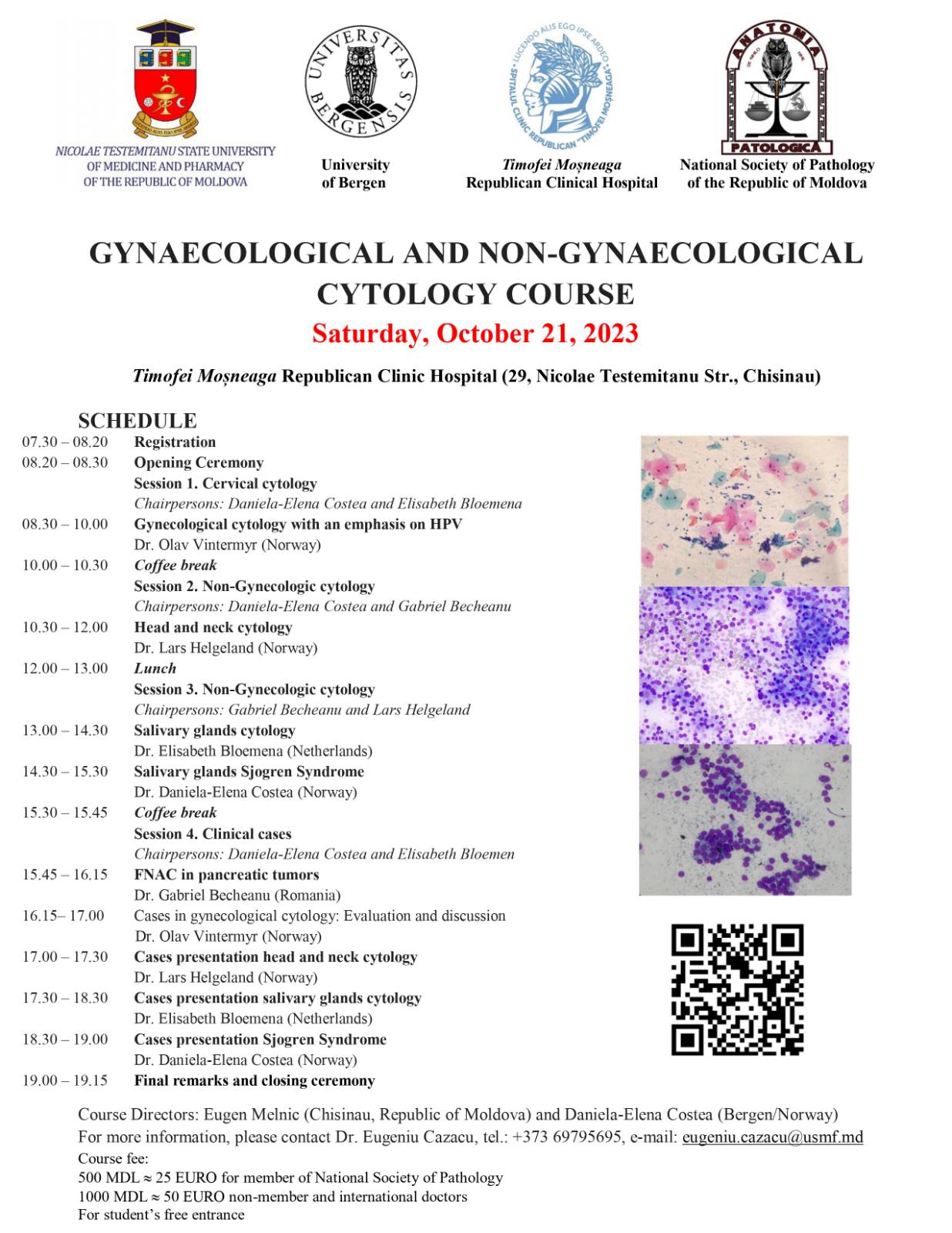 La conferință vor fi prezenți și își vor împărtăși experiența profesori cu renume mondial din România, Norvegia și Olanda. În cadrul cursului vor fi discutate probleme actuale în diagnosticul stărilor precanceroase a cancerului de col uterin, diagnosticul tumorilor cap-gât și glandele salivare și diagnosticarea și diferențierea tumorilor de pancreas prin metoda de aspirație cu ac fin. Programul evenimentului este atașat.
