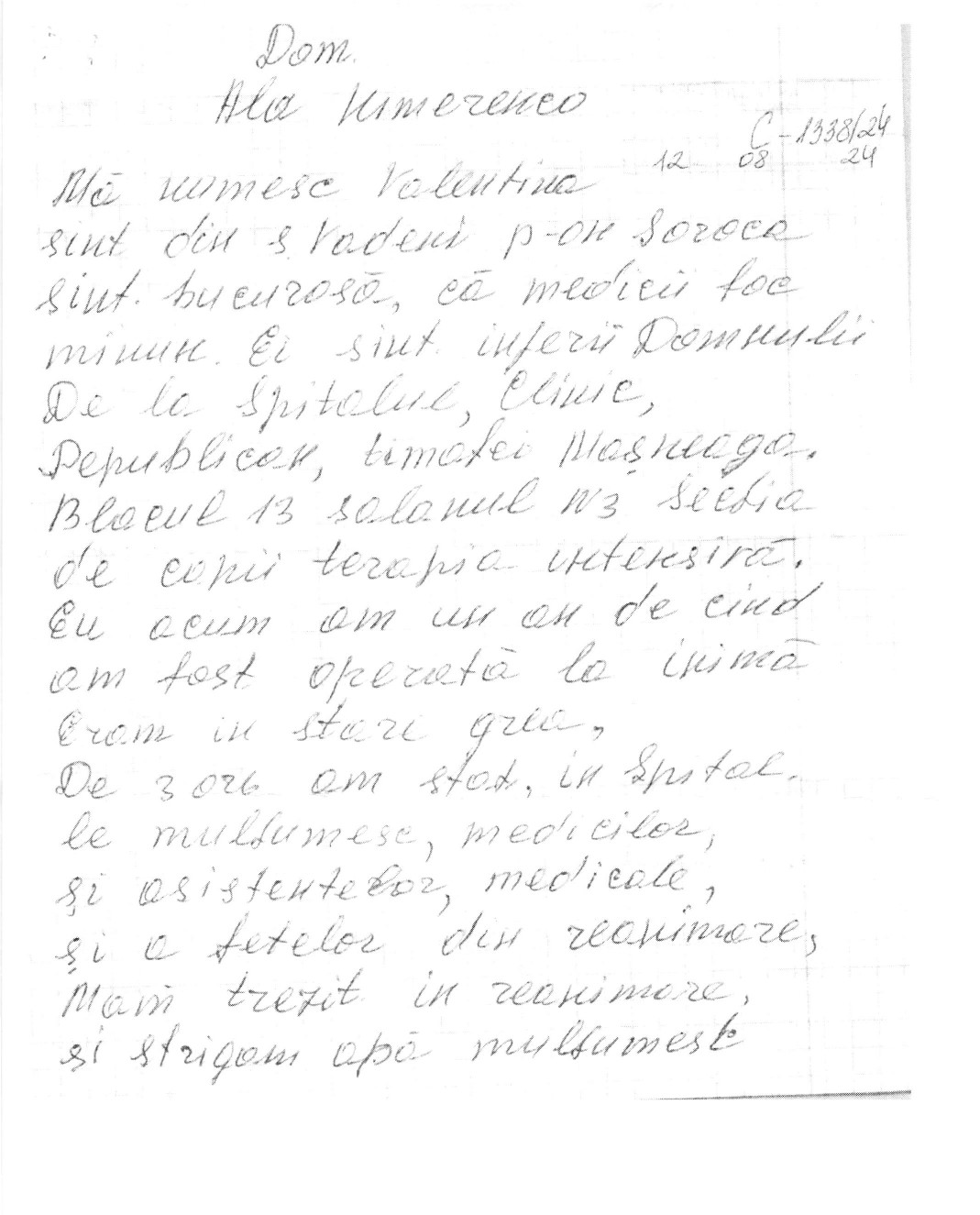 Pacienta noastră transmite un sincer Mulțumesc! pentru îngrijirea deosebită și profesionalismul echipei medicale a IMSP Spitalul Clinic Republican ”Timofei Moșneaga”: