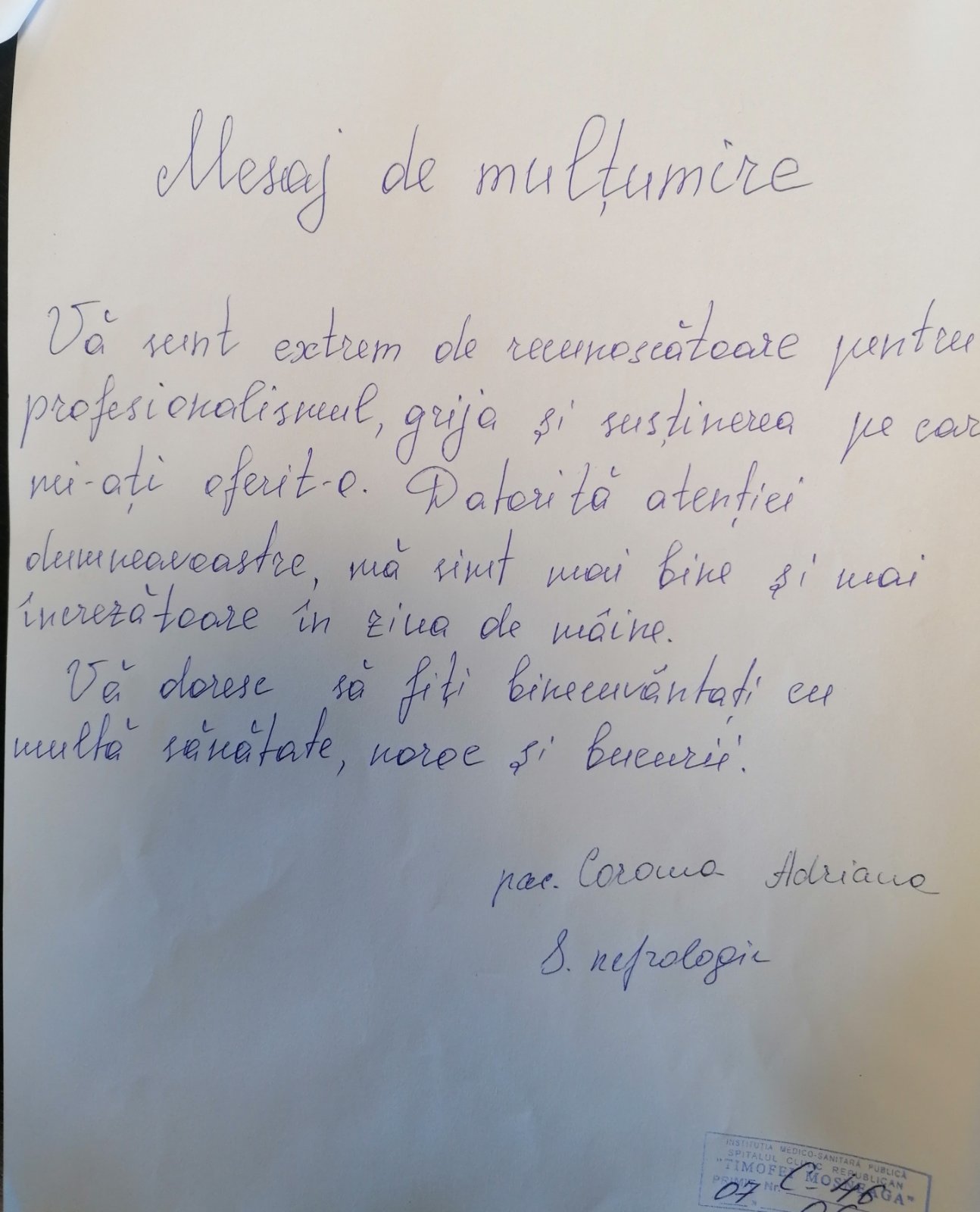 ”Pacientele salonului Nr. 8 vă exprimă toată recunoștința și mulțumirea pentru ajutorul acordat, grija și atenția oferită. Din toată inima vă dorim să aveți parte de tot ce e mai frumos și e mai bun din lume”.