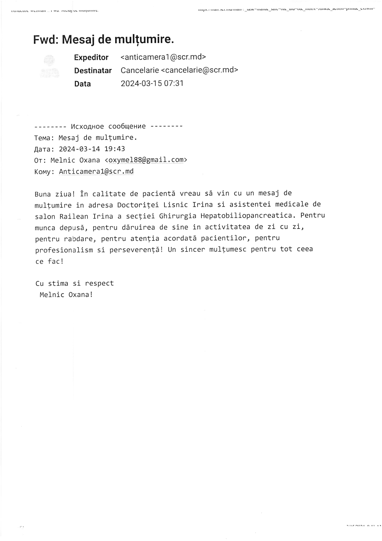 Mesaj de mulțumire doctoriței Irina Lisnic și asistentei medicale Irina Railean, secția Chirurgie Hepatobiliopancreatică