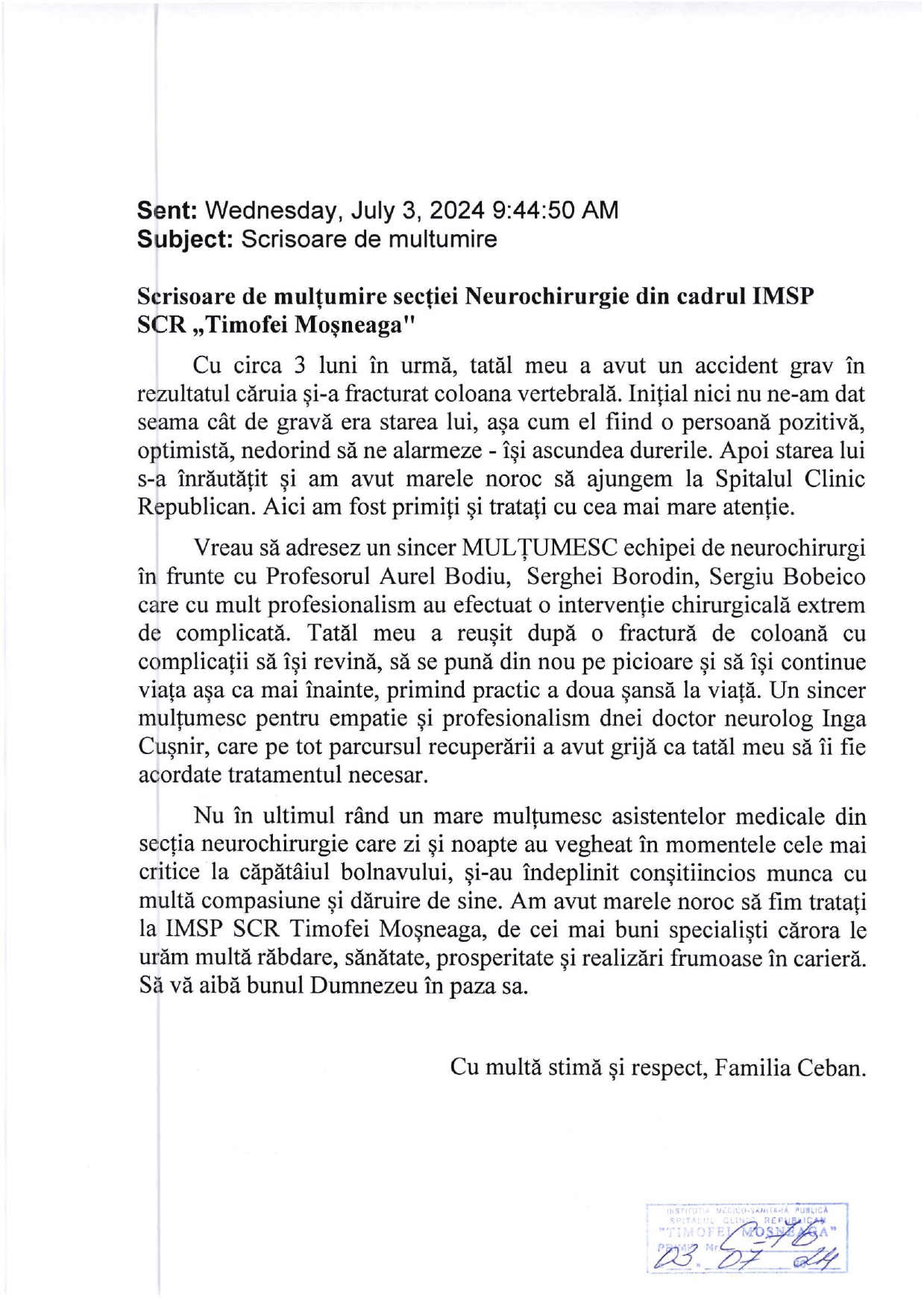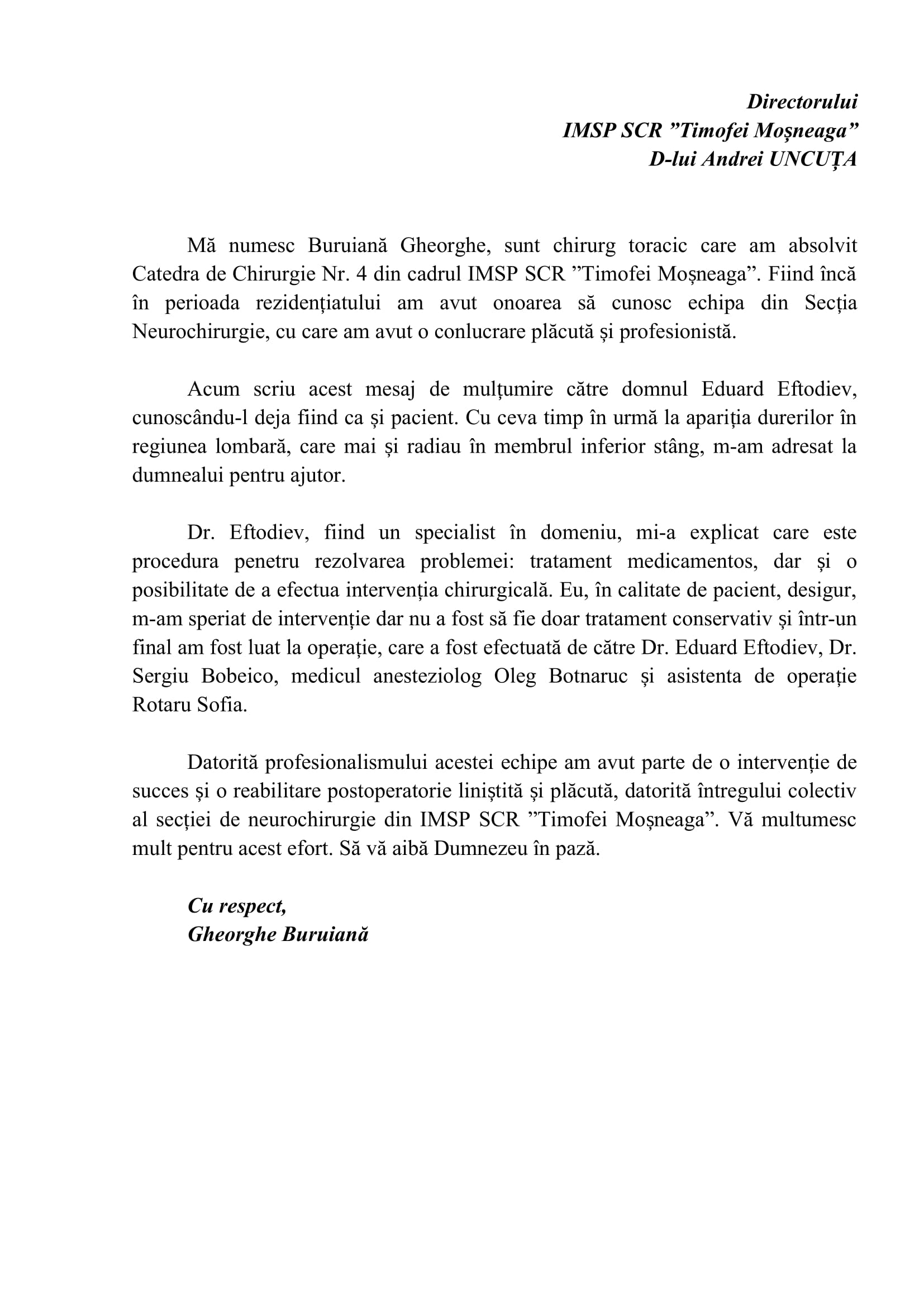 Mulțumire Secției Neurochirurgie
