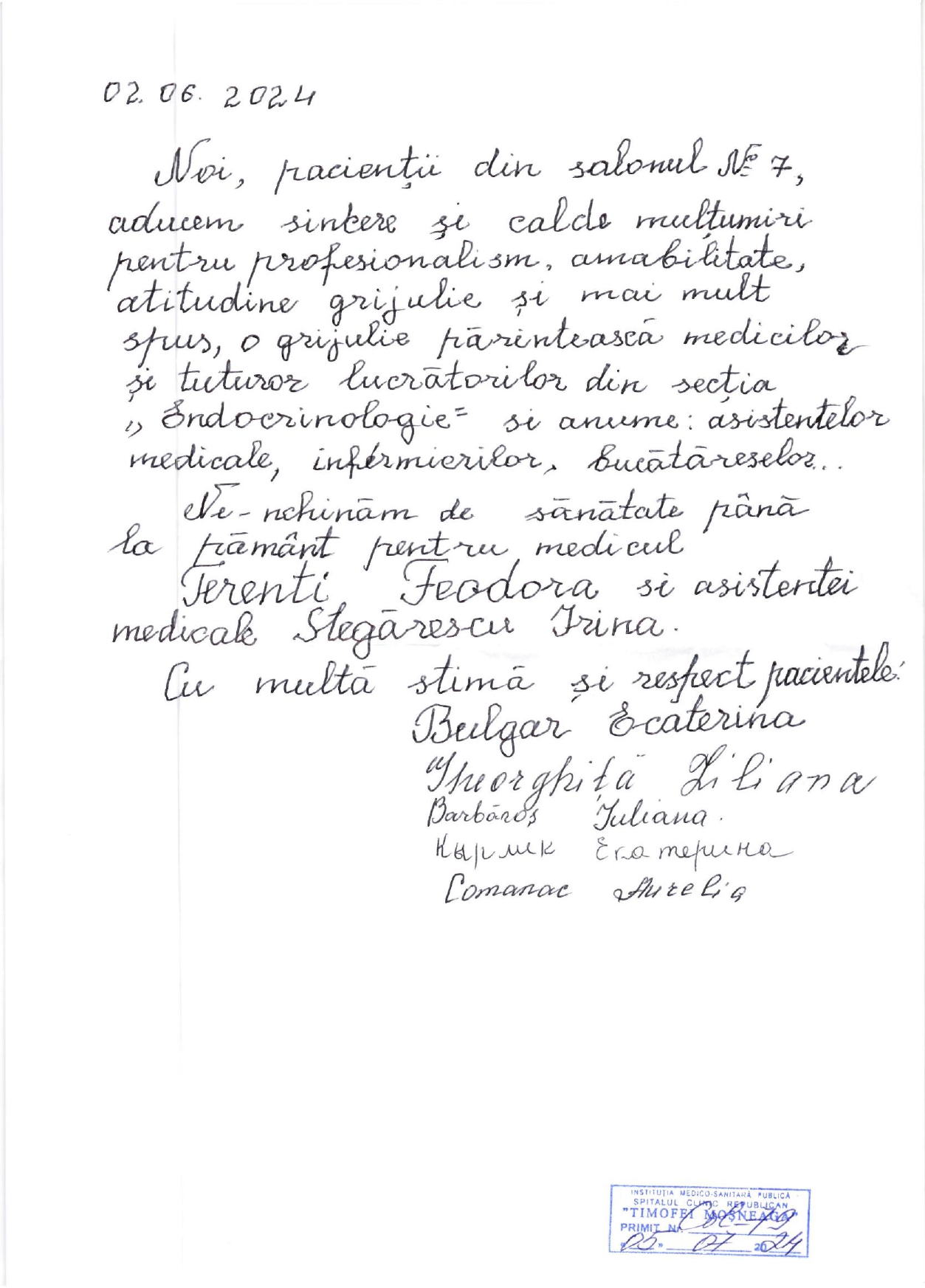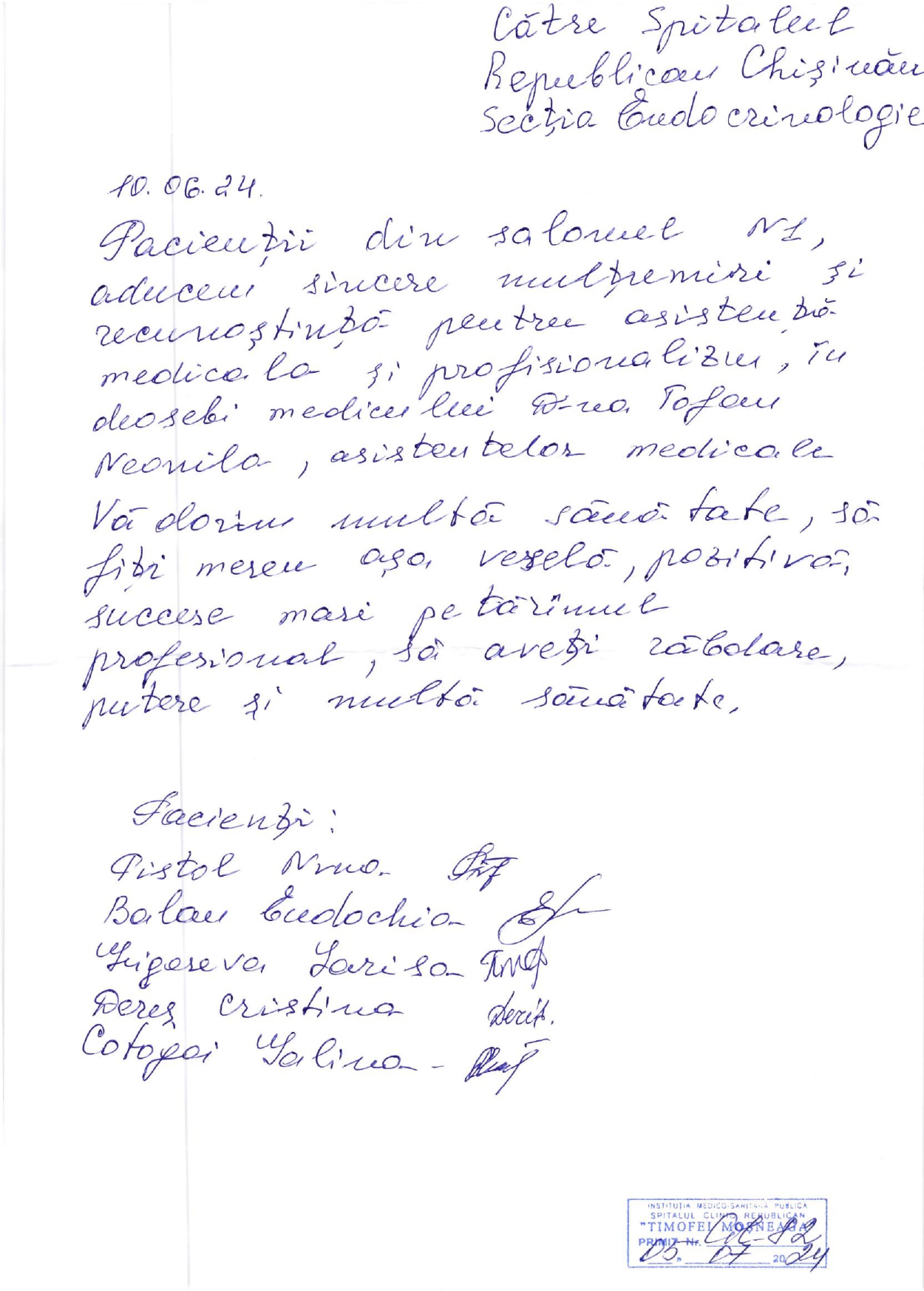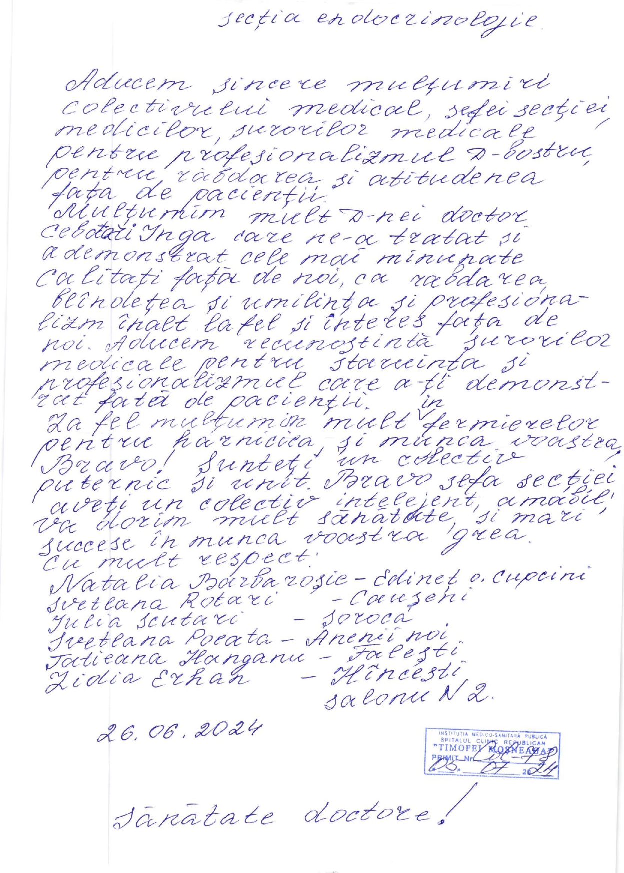 Mulțumiri Secției Endocrinologie