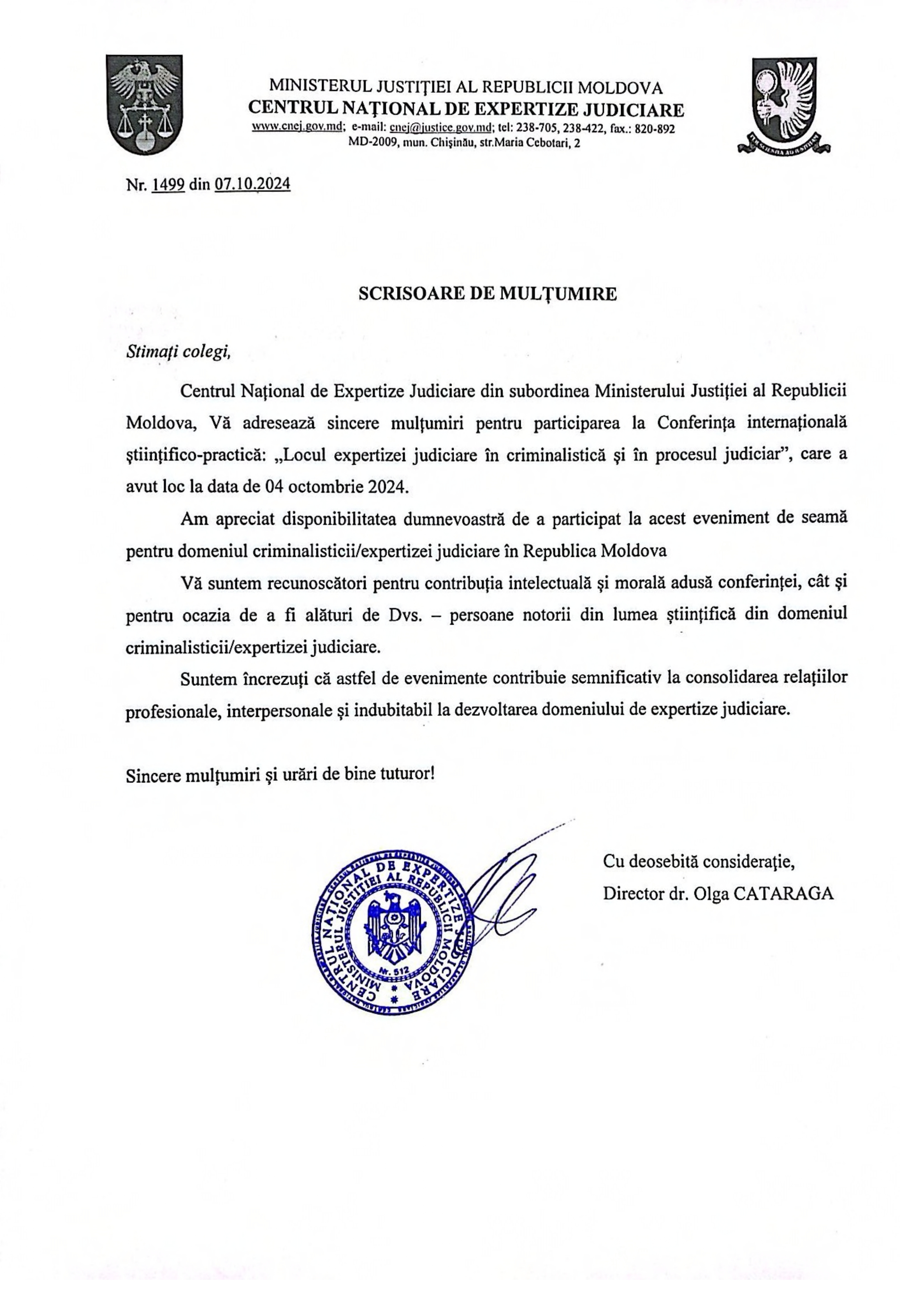 Pe data de 4 octombrie 2024, Veronica Calancea, psiholg clinician categoria superioară, doctor în psihologie, și psihologul clinician Svetlana Arnaut din cadrul IMSP SCR ”Timofei Moșneaga” au reprezentat cu mândrie instituția noastră la Conferința Internațională „Locul expertizei judiciare în criminalistică și în procesul judiciar”, organizată de către Centrul Național de Expertize Judiciare cu sprijinul Ministerului Justiției al Republicii Moldova.