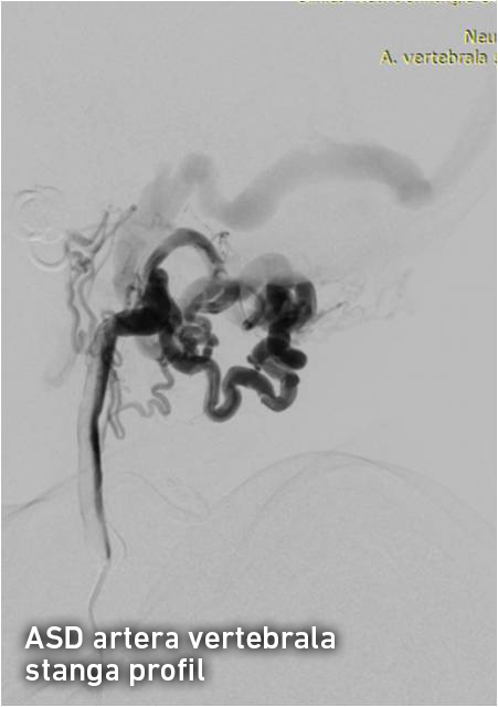 Pacientul V., 63 ani, prezenta la internare dureri persistente la nivelul jumătății drepte ale feței, zgomote permanente în ambele urechi şi contracții clonice la nivelul hemifeței stângi. Menţionăm că bolnavul a suportat un traumatism penetrant al gâtului aproximativ 25 ani în urmă. După traumatism bolnavul a remarcat apariția acufenelor pulsatile bilateral, iar de 2 ani în urmă au apărut durerile nevralgice la nivelul feței pe dreapta. Investigațiile imagistice prin CT-angio și IRM-angio au stabilit prezența unui conflict neuro-vascular la nivelul unghiului ponto-cerebelos drept și dilatarea venelor corticale și venelor cerebrale profunde. Staza venoasă la nivelul intracranian, prezența acufenelor pulsatile bilaterale și traumatismul cervical prin armă albă suportat ne-au făcut să suspectăm o fistulă arterio-venoasă la nivelul cervical sau la nivelul bazei craniului.