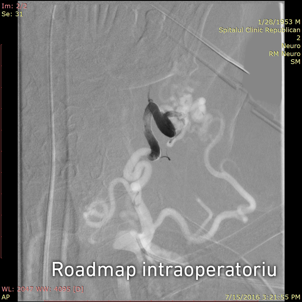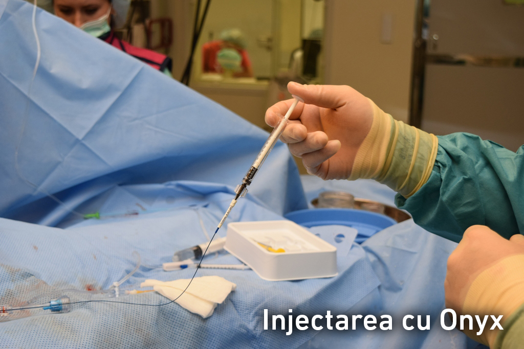 În cazul dat am optat pentru embolizarea fistulei cu un agent embolic lichid Onyx care se solidifică la contactul cu sângele pacientului și se depune pe pereții vaselor afectate. Există și alte tratamente endovasculare în cazul fistulelor arterio-venoase, cum ar fi ocluzia cu dispozitive de ocluzie mecanică (balonaşe detaşabile, coiluri, stenturi speciale flow diverters), utilizarea agenților de embolizare lichizi (Glubran, N-butyl cyanoacrilați (NBCA)), agenți sclerozanti (etanolul) sau combinarea lor (coil+ Onyx, coil+ NBCA, etc.). Selecția se face de la caz la caz, în funcție de tipul fistulei și experiența neuro-intervenționistului.