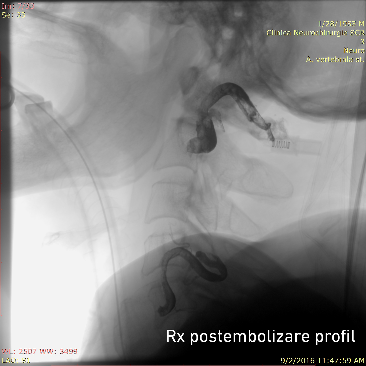Tratamentul endovascular a fost realizat grație colaborării multidisciplinare între neurochirurgul-intervenționist Alexandru Șumleanschi, cardiologul-intervenționist Eugen Calenici și neuro-anestezisteziolog Iana Cotorcea. Embolizarea a avut loc în 2 etape sub anestezie generală : pe 15.07.2016 a fost ocluzată artera cervicală ascendentă stângă (trunchiul tireo-cervical) cu Onyx și pe 02.09.2016 a fost realizată ocluzia arterei vertebrale stângi (segmentul V2-V3). Toate obiectivele propuse înainte de operație au fost realizate cu succes. Starea pacientului s-a ameliorat după embolizare: au dispărut acufenele, au diminuat durerile nevralgice, ceea ce a permis diminuarea tratamentului neurotrop. Spre deosebire de chirurgia clasică, pacientul a necesitat timp redus de spitalizare și recuperarea după embolizare a fost rapidă.