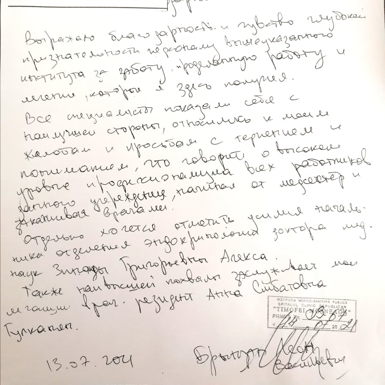 Выражаю благодарность и чувство глубокой признательности персоналу РКБ имени «Т.Мошняги», за заботу, проделанную работу и лечение, которые я здесь получил. Все специалисты показали себя с наилучшей стороны, относились к моим жалобам и просьбам с терпением и пониманием, что говорит о высоком уровне профессионализма всех работников данного учреждения, начиная от мед.сестер и заканчивая врачами. Отдельно хочется отметить усилия главы отделения Эндокринологии, доктора мед.наук Зинаиду Алексу. Так же хочу выразить особую благодарность врачу- резиденту Анне Гулканян.