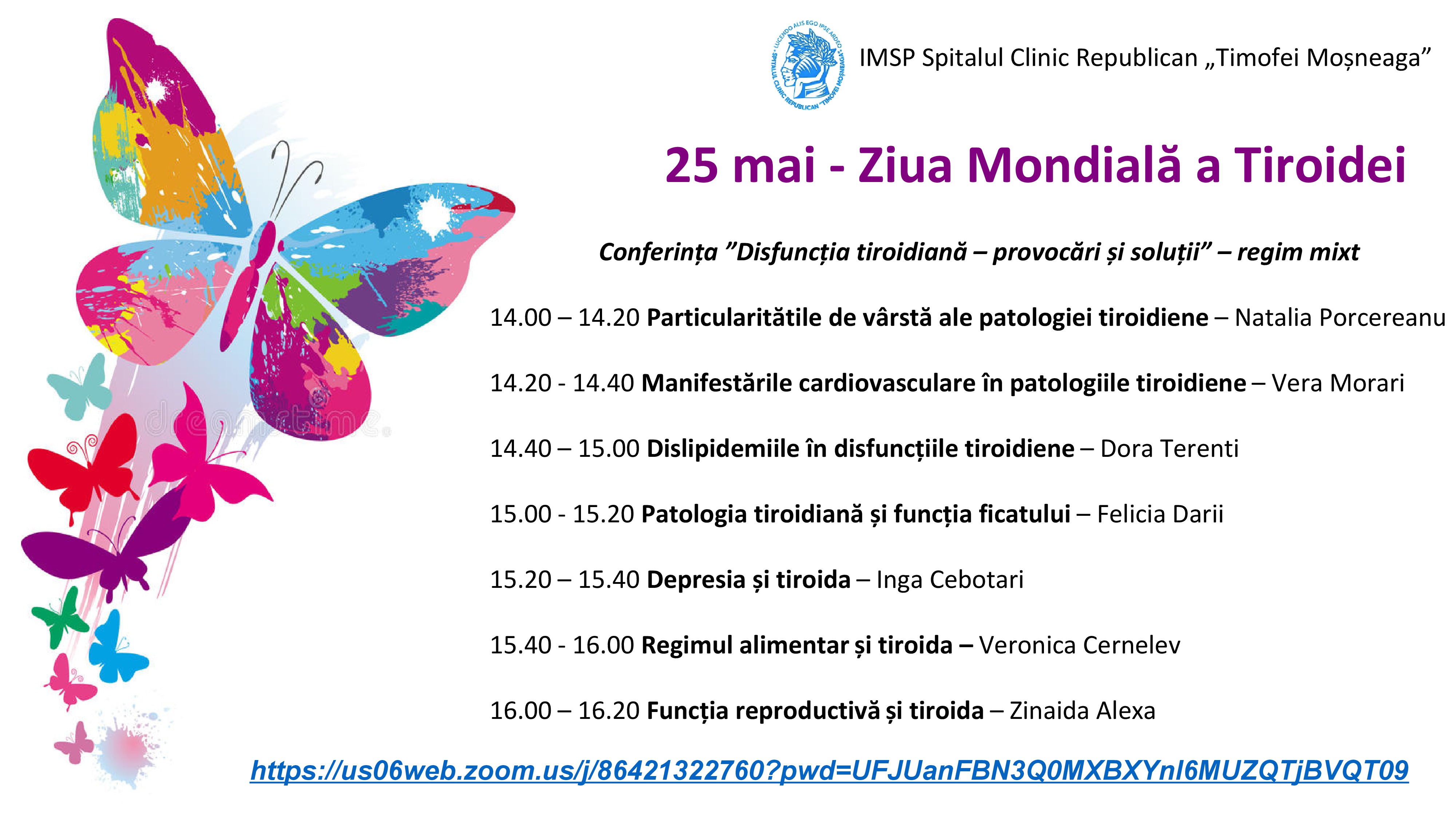 În data de 25 mai, începând cu ora 14.00, în contextul Zilei Mondiale a Tiroidei, în incinta IMSP SCR ”Timofei Moșneaga” va avea loc conferința ”Disfuncția tiroidiană – provocări și soluții”.