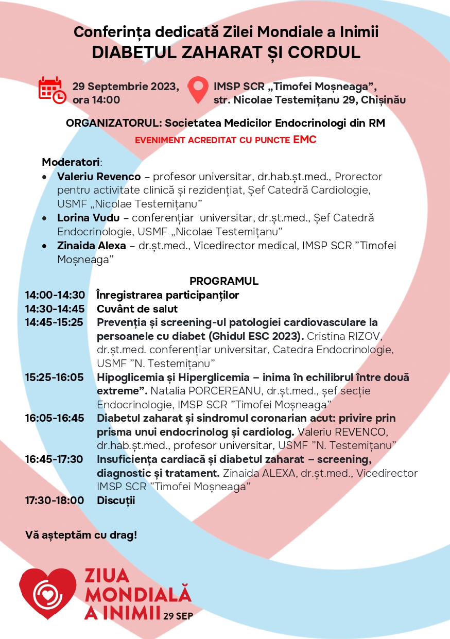Vineri, 29 septembrie, la IMSP SCR ”Timofei Moșneaga” va avea loc Conferința dedicată Zilei Mondiale a Inimii cu genericul „DIABETUL ZAHARAT ȘI CORDUL”. Evenimentul va începe la ora 14.00, în sala de conferințe a instituției și este organizat de Societatea Medicilor Endocrinologi din Republica Moldova.