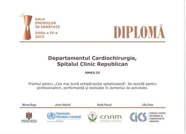 Menționăm cu deosebită mîndrie că trofeul pentru Cea mai bună echipă/secție spitalicească a fost oferit Departamentului de Cardiochirurgie din IMSP Spitalul Clinic Republican. „Pentru noi, premiul este în primul rînd un semn de recunoștință pentru lucrul pe care îl facem zi de zi, dar, în același timp, este și un credit pentru viitor”, a afirmat dl Aureliu Batrînac, șef Departament, după momentul oficial al evenimentului.