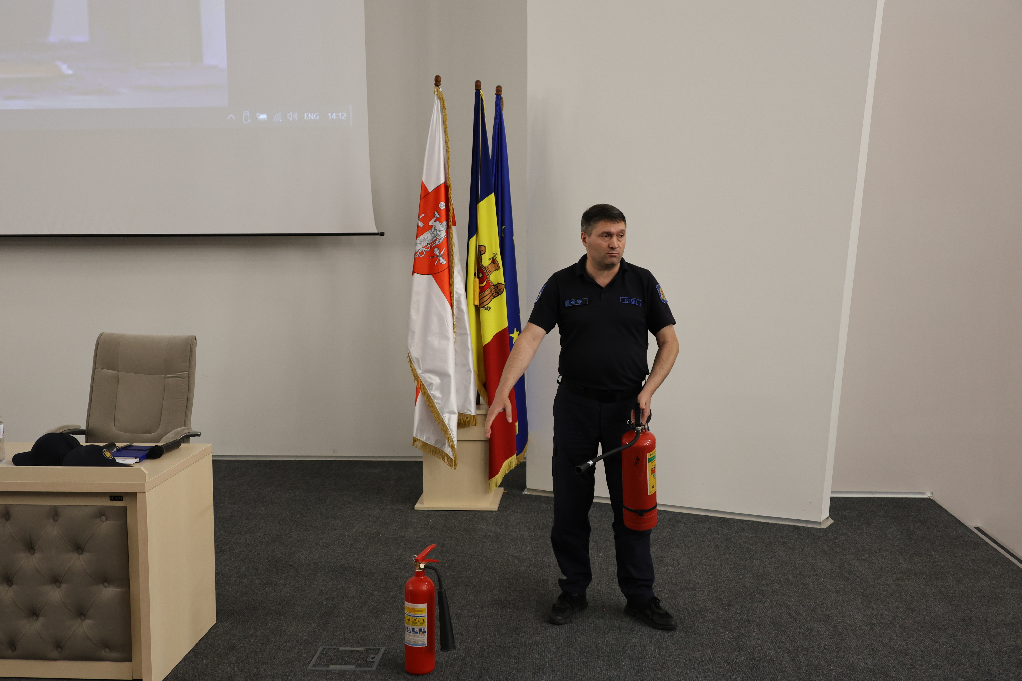 Exercițiile teoretice și practice au fost prezentate de serviciul antiincendiar al instituției în comun cu angajații IGSU: șef al Secției Prevenție a Detașamentului de Salvatori și Pompieri, sectorul Centru, locotenent-colonel, serviciul intern – Scutelnic Vladislav, șef de Gardă al Detașamentului de Salvatori și Pompieri, sectorul Centru, plutonier-adjutant, serviciul intern – Polșcin Dumitru, șef serviciu antiincendiar SCR, Vasile Corjan.