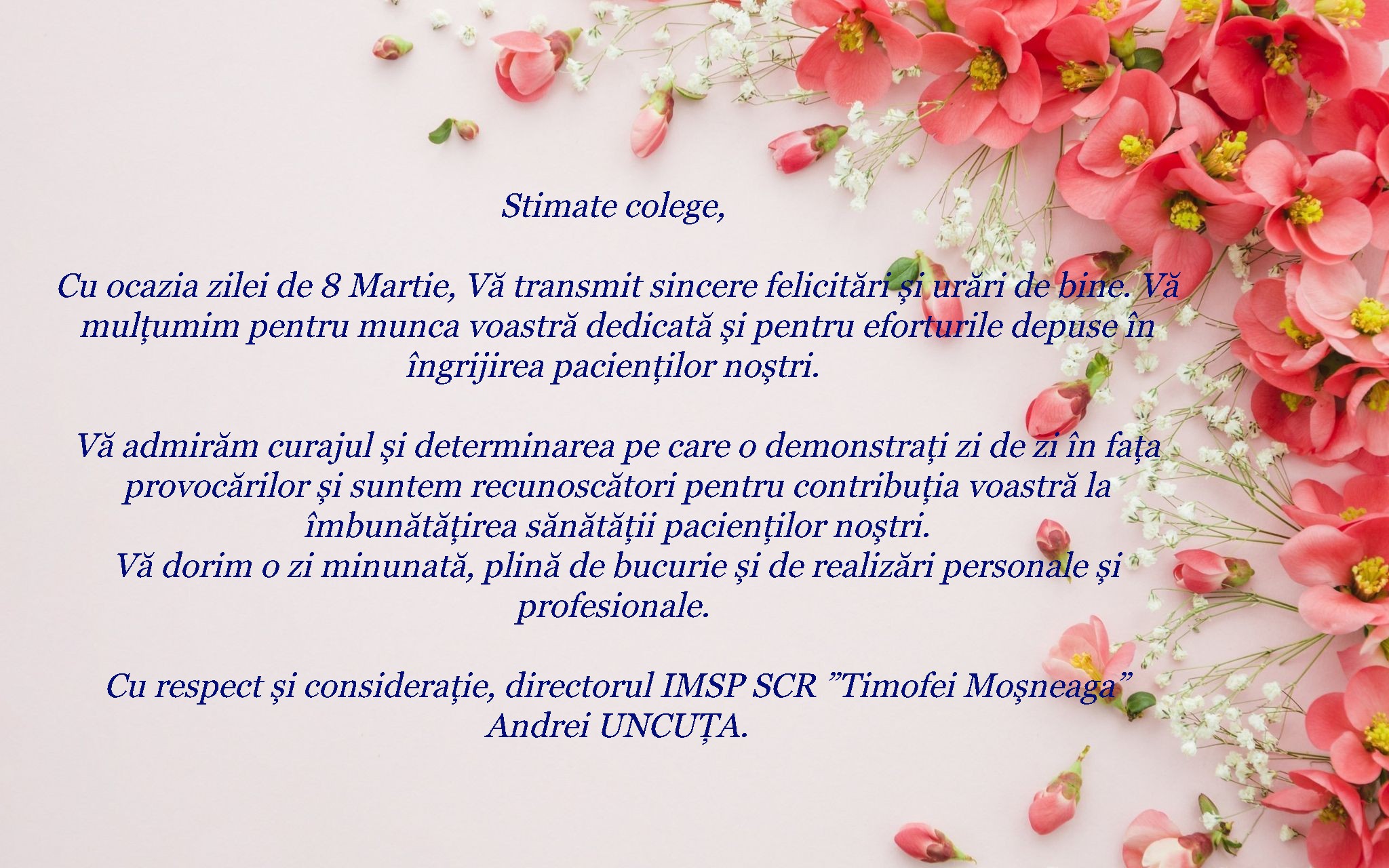 Cu ocazia zilei de 8 Martie, Vă transmit sincere felicitări și urări de bine. Vă mulțumim pentru munca voastră dedicată și pentru eforturile depuse în îngrijirea pacienților noștri. Vă admirăm curajul și determinarea pe care o demonstrați zi de zi în fața provocărilor și suntem recunoscători pentru contribuția voastră la îmbunătățirea sănătății pacienților noștri.