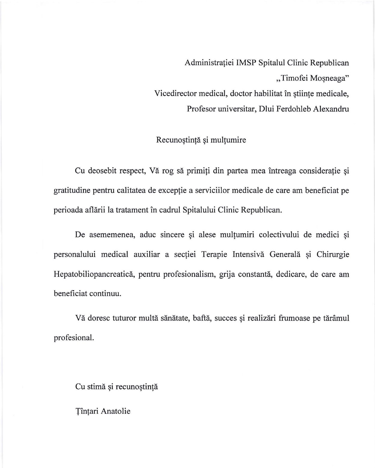 Mesaj de mulțumire secțiilor Terapie Intensivă generală și Chirurgie hepatobiliopancreatică