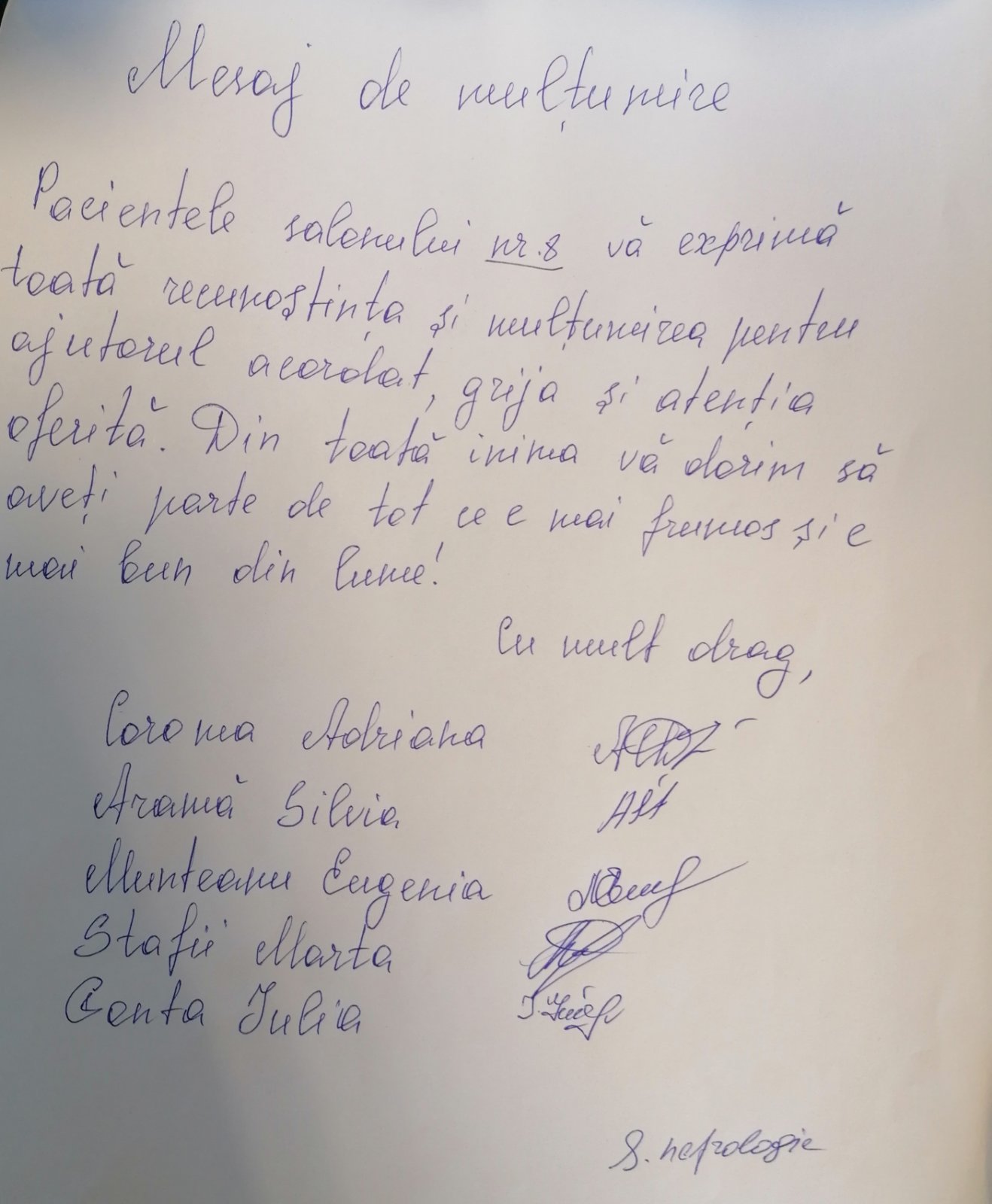 ”Pacientele salonului Nr. 8 vă exprimă toată recunoștința și mulțumirea pentru ajutorul acordat, grija și atenția oferită. Din toată inima vă dorim să aveți parte de tot ce e mai frumos și e mai bun din lume”.