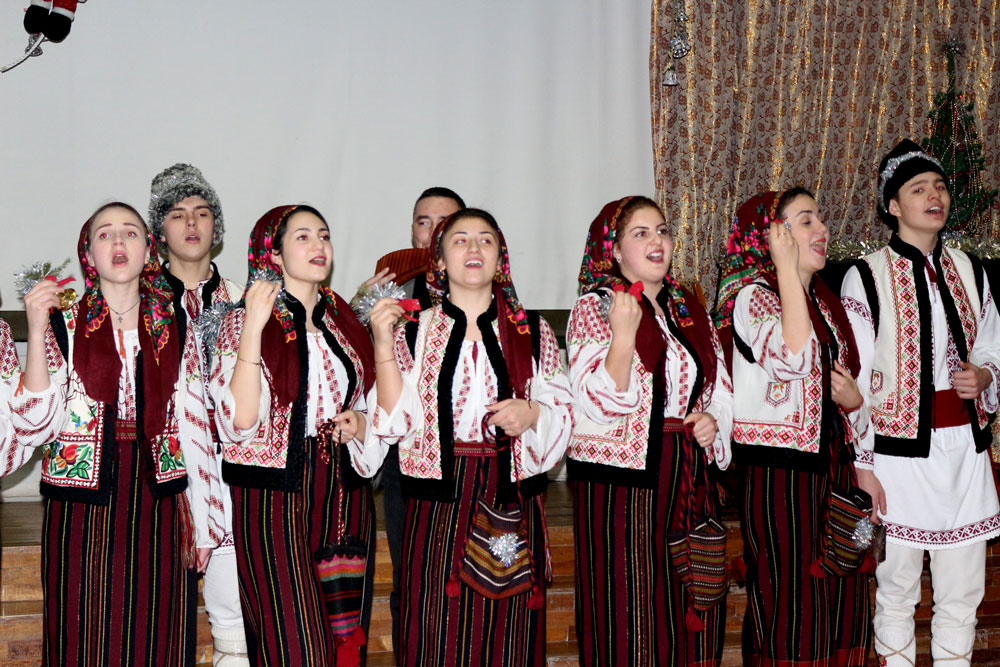 Atmosfera de sărbătoare a fost completată de ansamblul de cântece şi dansuri naţionale „Romaniţa” al Colegiului de Medicină şi Farmacie. Ei au colindat spectatorii, le-au urat belşug în toate şi LA MULŢI ANI!