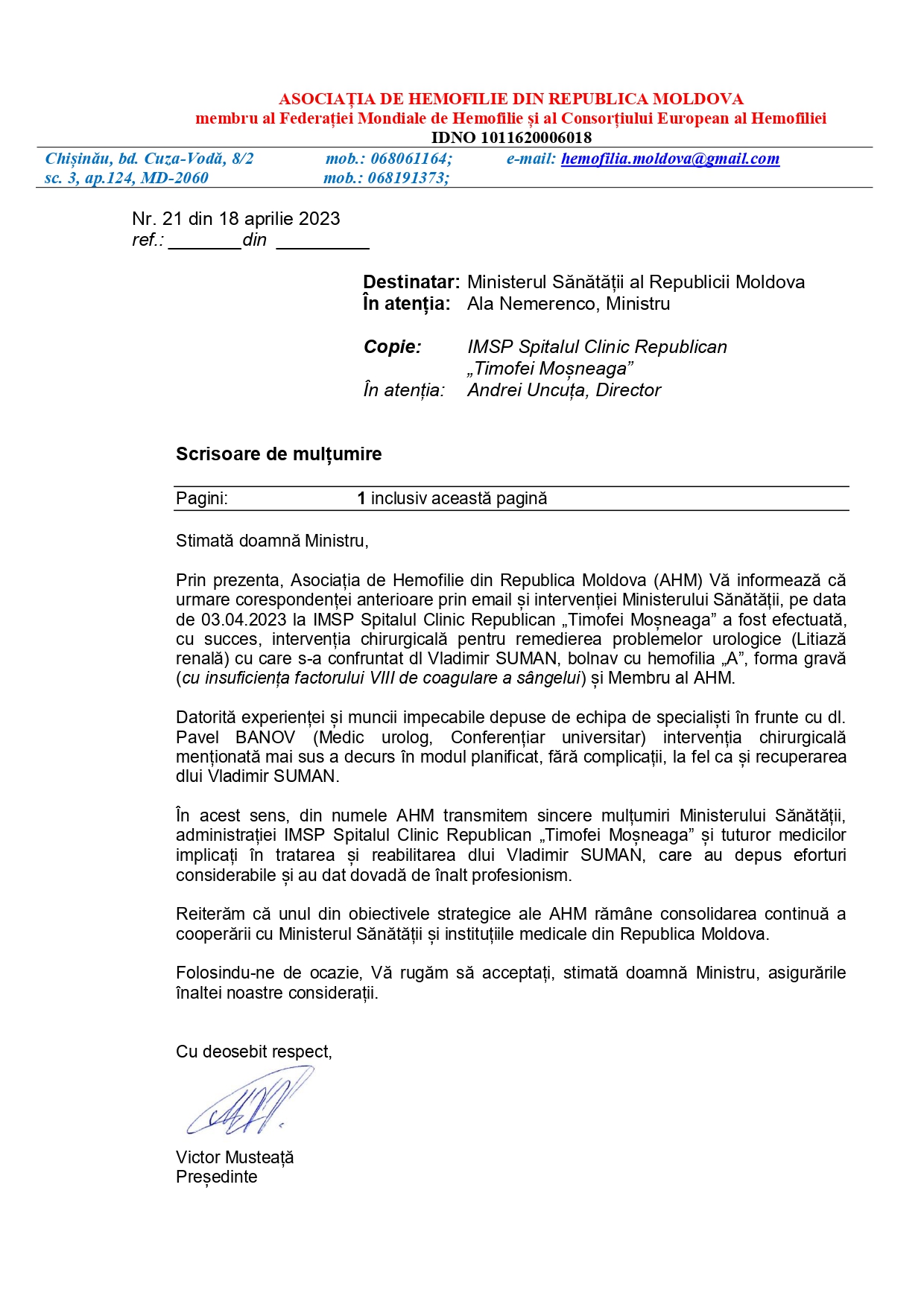 Asociația de Hemofilie din Republica Moldova transmite mesaj de mulțumire medicilor din IMSP SCR ”Timofei Moșneaga”: