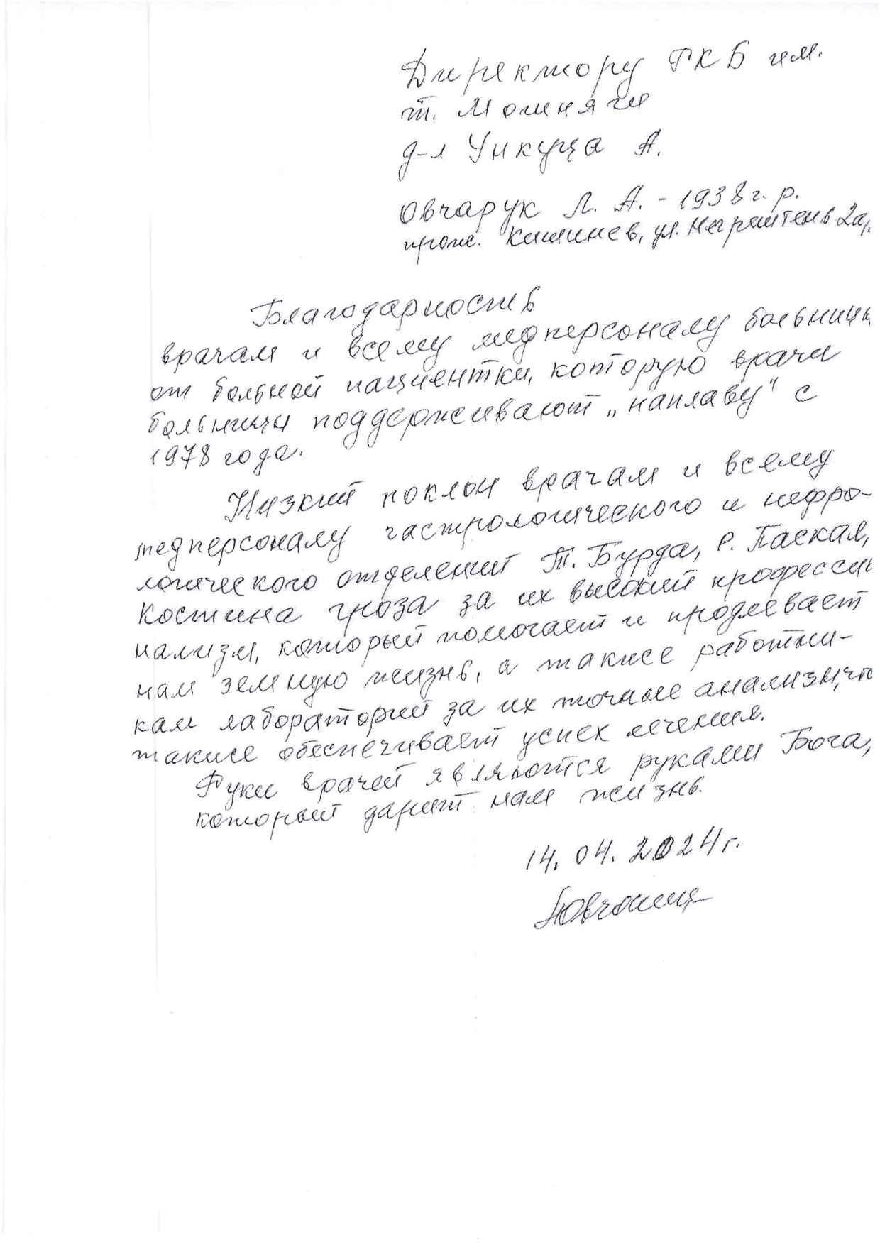 Mulțumire medicilor nefrologi: Rodica Pascal (șef secție Nefrologie), Costina Groza și lefei secției Gastroenterologie, Tatiana Burda.