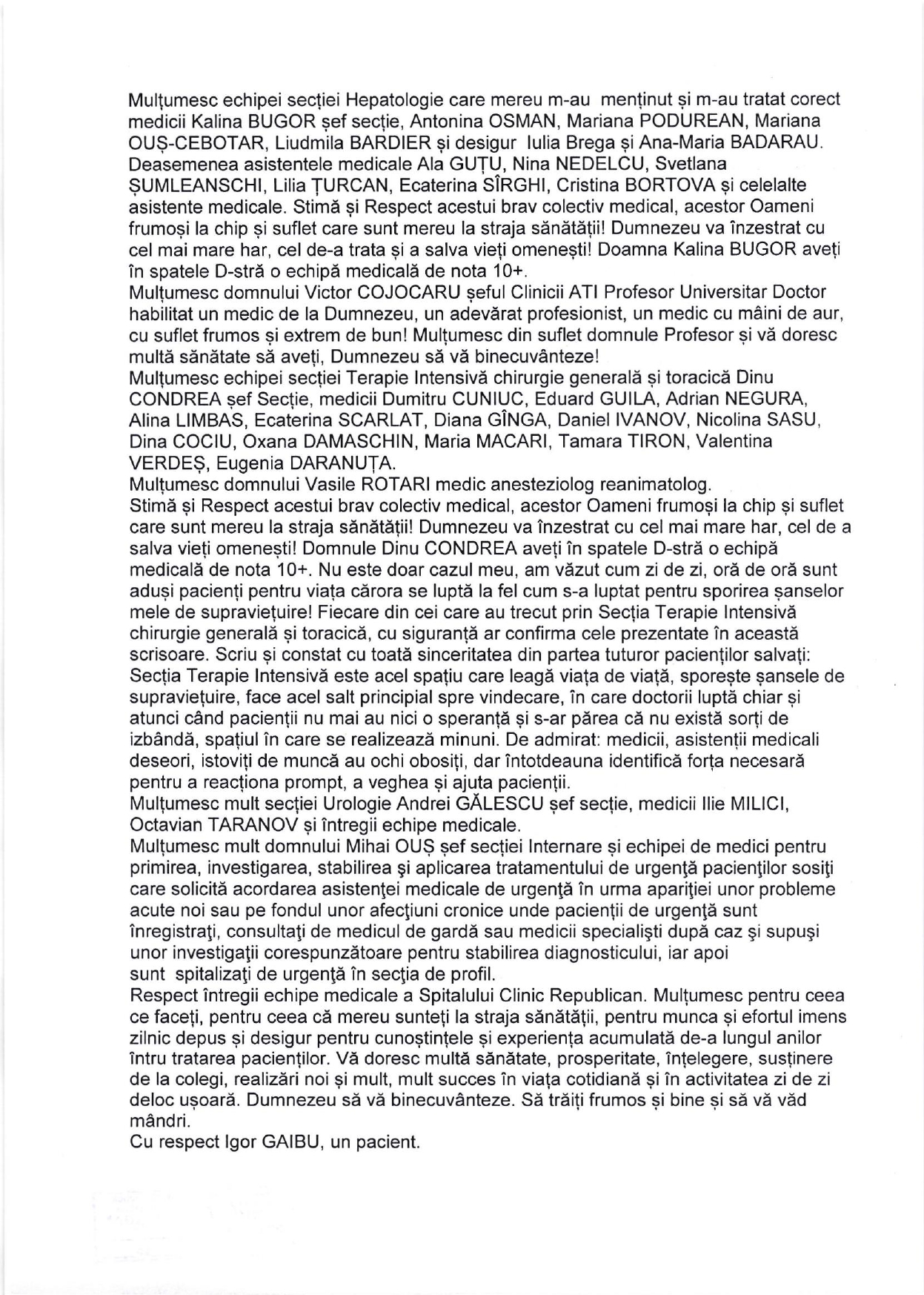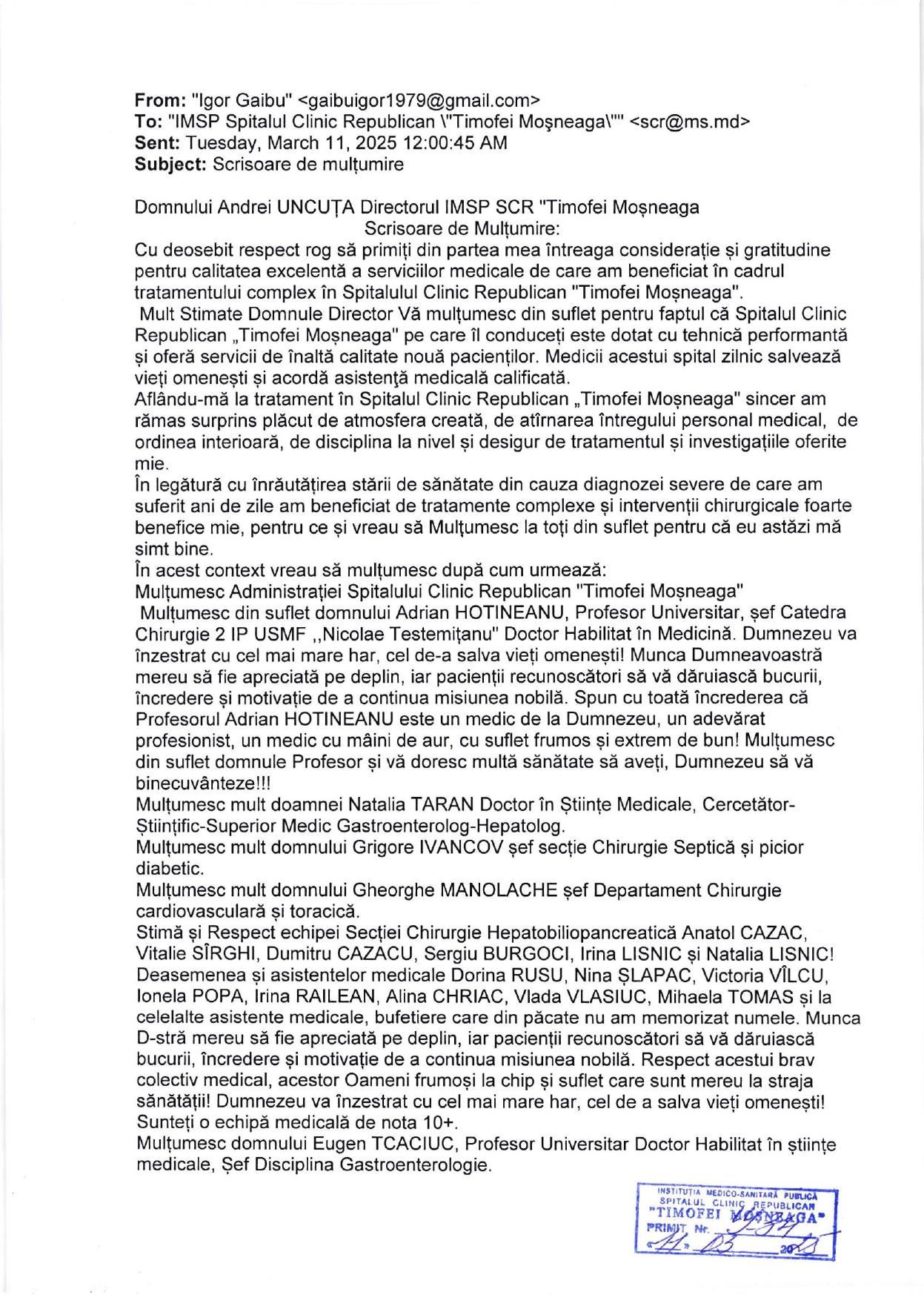 Mulțumire întregii echipe a SCR ”Timofei Moșneaga”