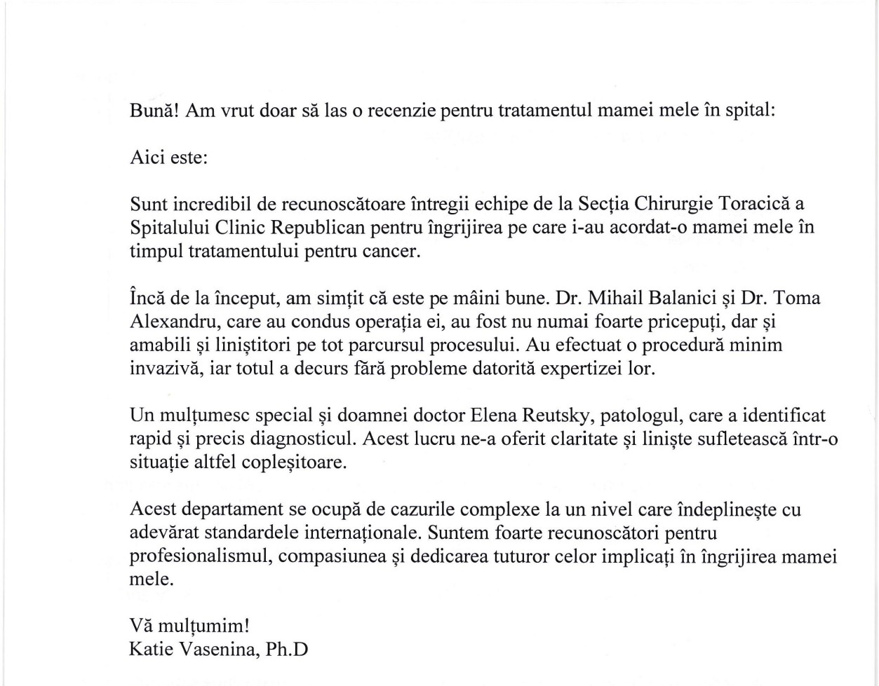 Mulțumire Secției Chirurgie toracică