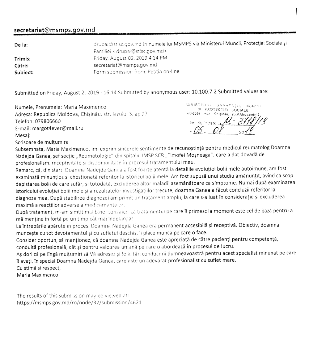 Prin prezenta, eu, Diru Aliona, vreau să aduc sincere mulțumiri domnului Ciubotaru Anatol și doamnei Nadejda Ganea, care au fost receptivi și m-au îndrumat pas cu pas la consultațiile minuțioase și desfășurate pentru a-mi depista boala autoimună pe care o aveam și nu cunoșteam, având deja consecințe rele din motiv că nu mă tratam corespunzător.