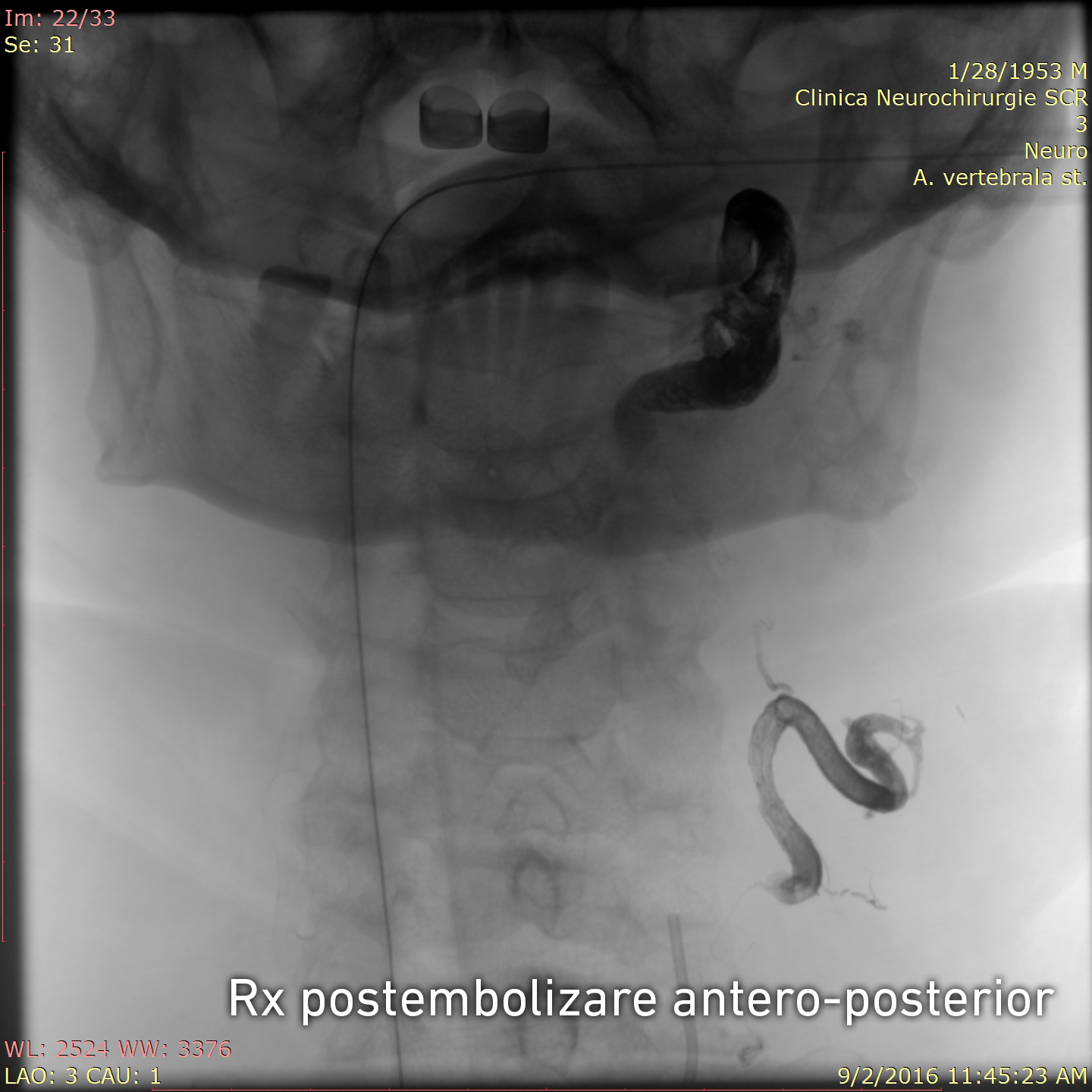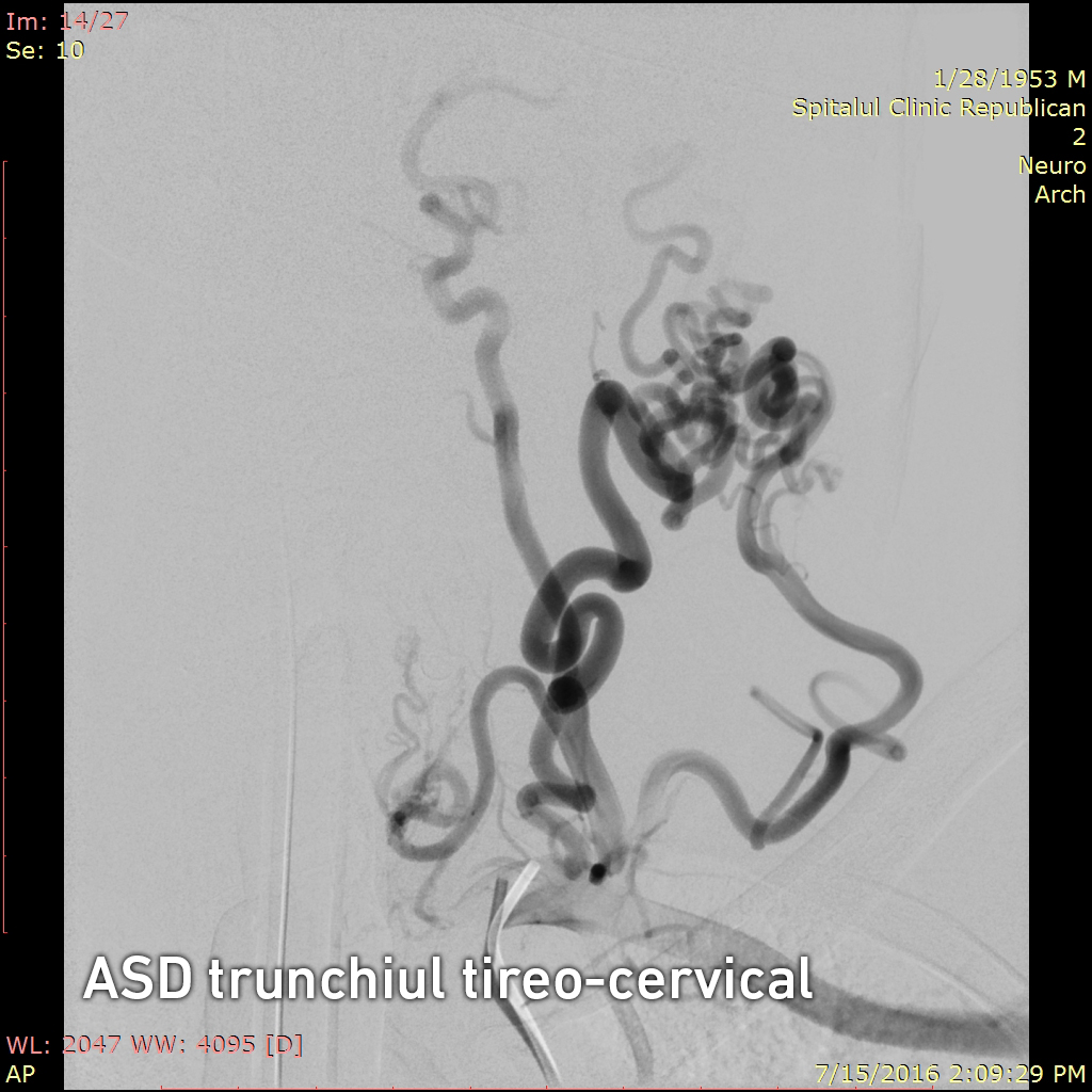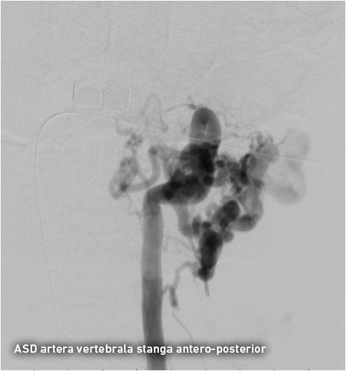 Pentru precizarea diagnosticului a fost nevoie de o investigație invazivă și anume angiografia cu substracție digitală a vaselor capului și gâtului, ce reprezintă „standartul de aur “ în patologia neurovasculară. Angiografia clasică diagnostică a confirmat existența unei fistulei arterio-venoase posttraumatice cervicale pe stânga și ocluzia venei jugulare stângi. Fistula arterio-venoasă posttraumatică reprezintă comunicarea anormală dintre sistemele venos și arterial apărută după leziunea peretelui vascular. În cazul dat sângele arterial din artera vertebrală stângă și trunchiul tireo-cervical stâng pătrundea sub presiune înaltă în porțiunea incipientă a venei jugulare stângi, apoi retrograd în sinusul sigmoid stâng, sinusurile transverse, sinusul sigmoid drept și se drena extracranian prin vena jugulară dreaptă. Arterializarea sângelui din sinusurile venoase ale durei mater are ca consecință creșterea presiunii venoase intracraniene, apariția stazei venoase și dilatarea venelor cerebrale superficiale și profunde. Ca rezultat, bolnavii cu fistule arterio-venoase a vaselor precerebrale și cerebrale suferă de dureri de cap și de ochi, dereglări cognitive, afectarea nervilor cranieni (conflict neuro-vascular cu n. trigemen și n. facial) și acufene. Hipertensiunea venoasă intracraniană poate cauza accidente vasculare hemoragice, ce reprezintă una din cauzele principale de morbiditate şi mortalitate.